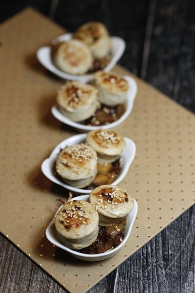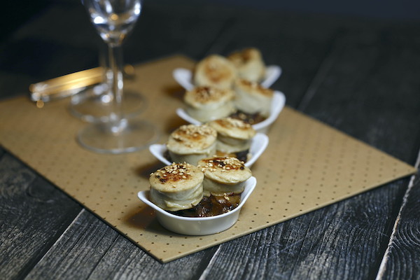 Répartir le confit d’oignon dans des petits ramequins, ajouter les tranches de boudin et saupoudrer de sésame torréfié.