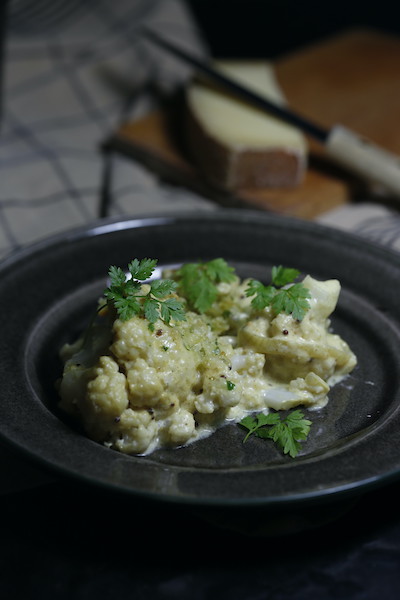 Chou-fleur gratiné à la crème de moutarde et aux épices