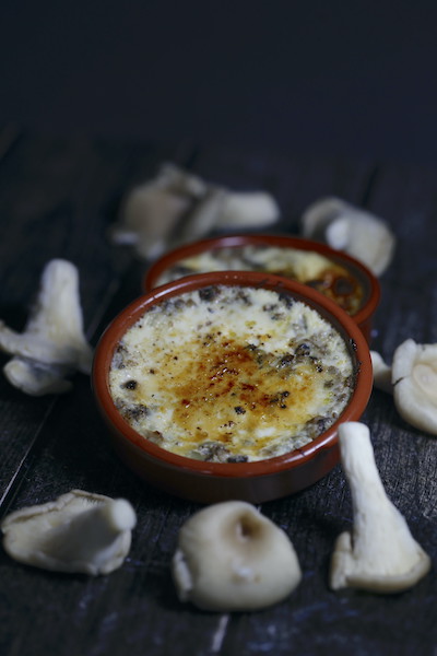 Fouetter les oeufs avec le lait et la crème. Saler, poivrer et verser sur les préparations aux pleurotes.