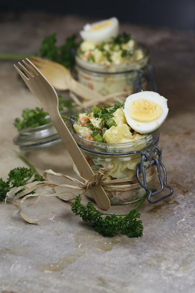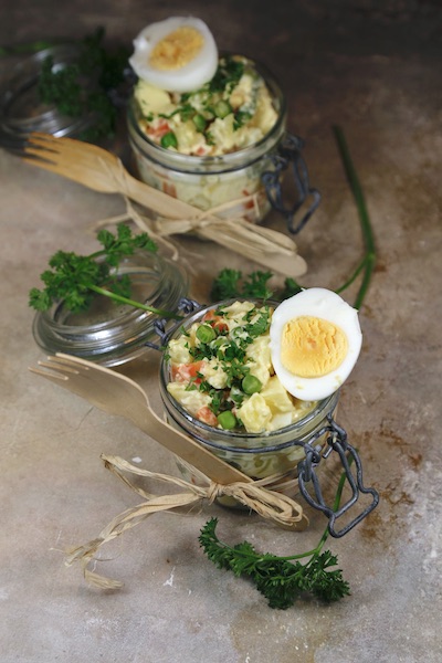 Laisser refroidir les légumes égouttés et les déposer dans un saladier. Ajouter la pomme, l’ail, l’oignon, le céleri, la mayonnaise, le jus de citron, le persil ciselé, deux oeufs durs coupés en petits morceaux sel et poivre. Mélanger.