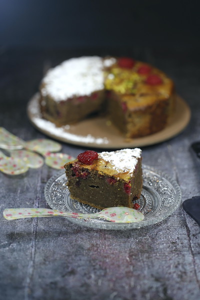 Mélanger le lait avec la purée de pistaches et l’huile. Ajouter le mélange aux oeufs et mélanger à nouveau. Ajouter le mélange sec, mélanger doucement jusqu’à obtention d’une pâte homogène.