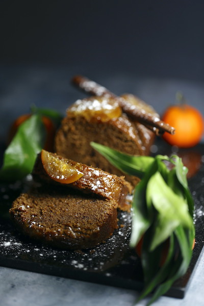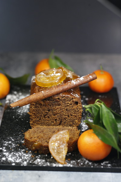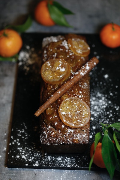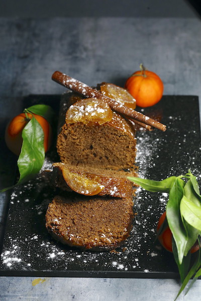 Recouvrir le cake de gelée d’agrumes et poser quelques tranches de clémentine confite. Saupoudrer de sucre glace.
