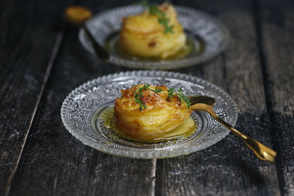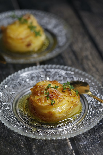 Déposer les tranches de pommes de terre les unes sur les autres dans des empreintes à muffins en ajoutant un peu de mélange au beurre entre chaque tranche.