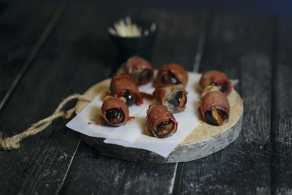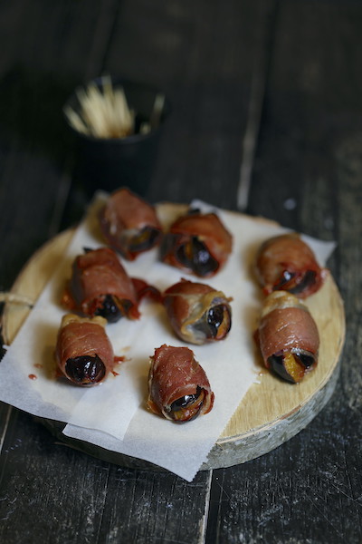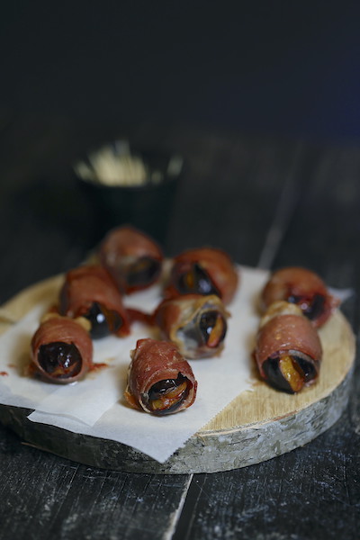 Enrouler chaque fruit dans le lard et maintenir avec un pic en bois si nécessaire. Déposer dans un plat à four.