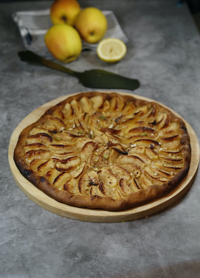 Verser la crème pistache sur le fond de tarte (à 2 cm environ du bord) et poser les tranches de pommes. Rabattre le bord.