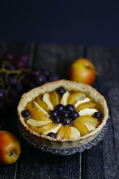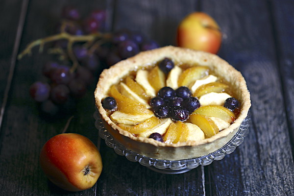 Étaler la confiture sur le fond de tarte et déposer les fruits en les intercalant.