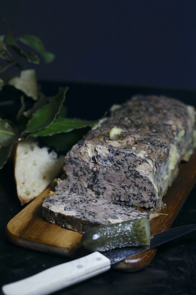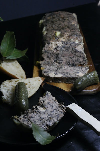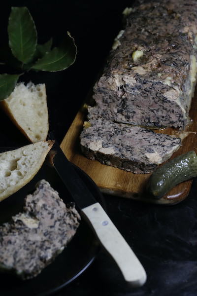 Verser la préparation dans une terrine graissée, tasser et poser 2 feuilles de laurier et 2 brins de thym. Recouvrir avec la peau et le gras de canard et le couvercle de la terrine.